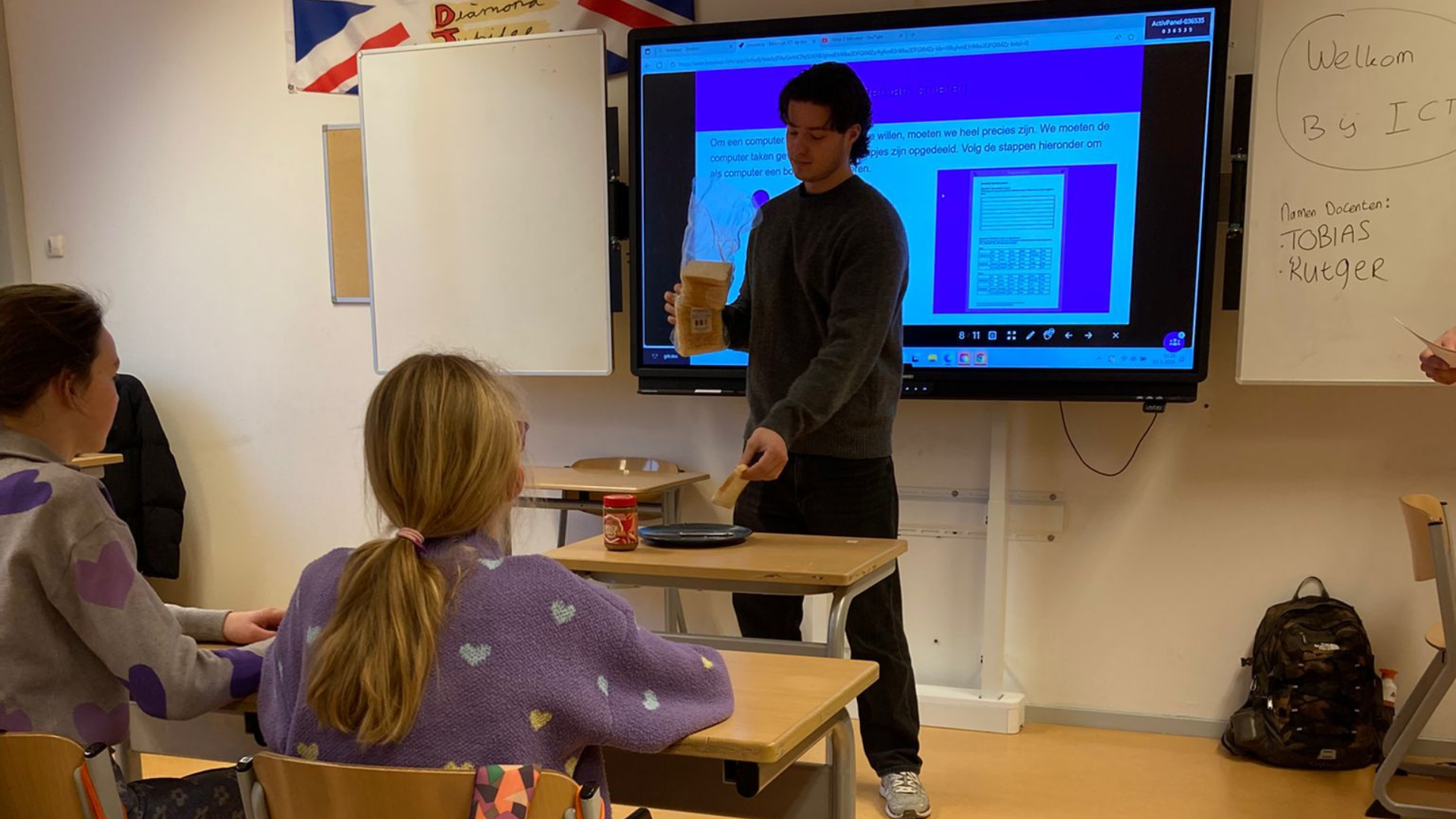 We starten de les met een interactieve werkvorm. Een docent doet zich voor als een robot die een boterham gaat smeren. De leerlingen moeten stap voor stap instructies geven: pak de broodzak met je linkerhand, haal het clipje eraf met je rechterhand, leg het clipje op tafel, open de broodzak, enzovoort.